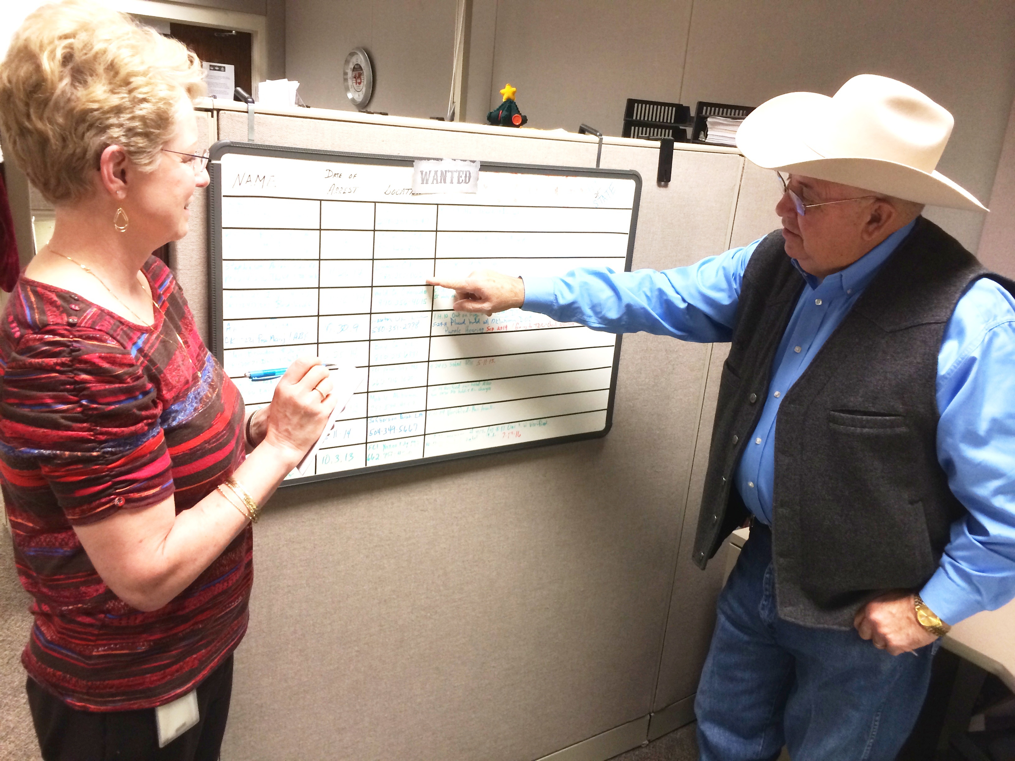 Parker County Sheriff’s Captain Ray Wright studies the warrant board with Sheriff’s Warrant Clerk Teri Flora.