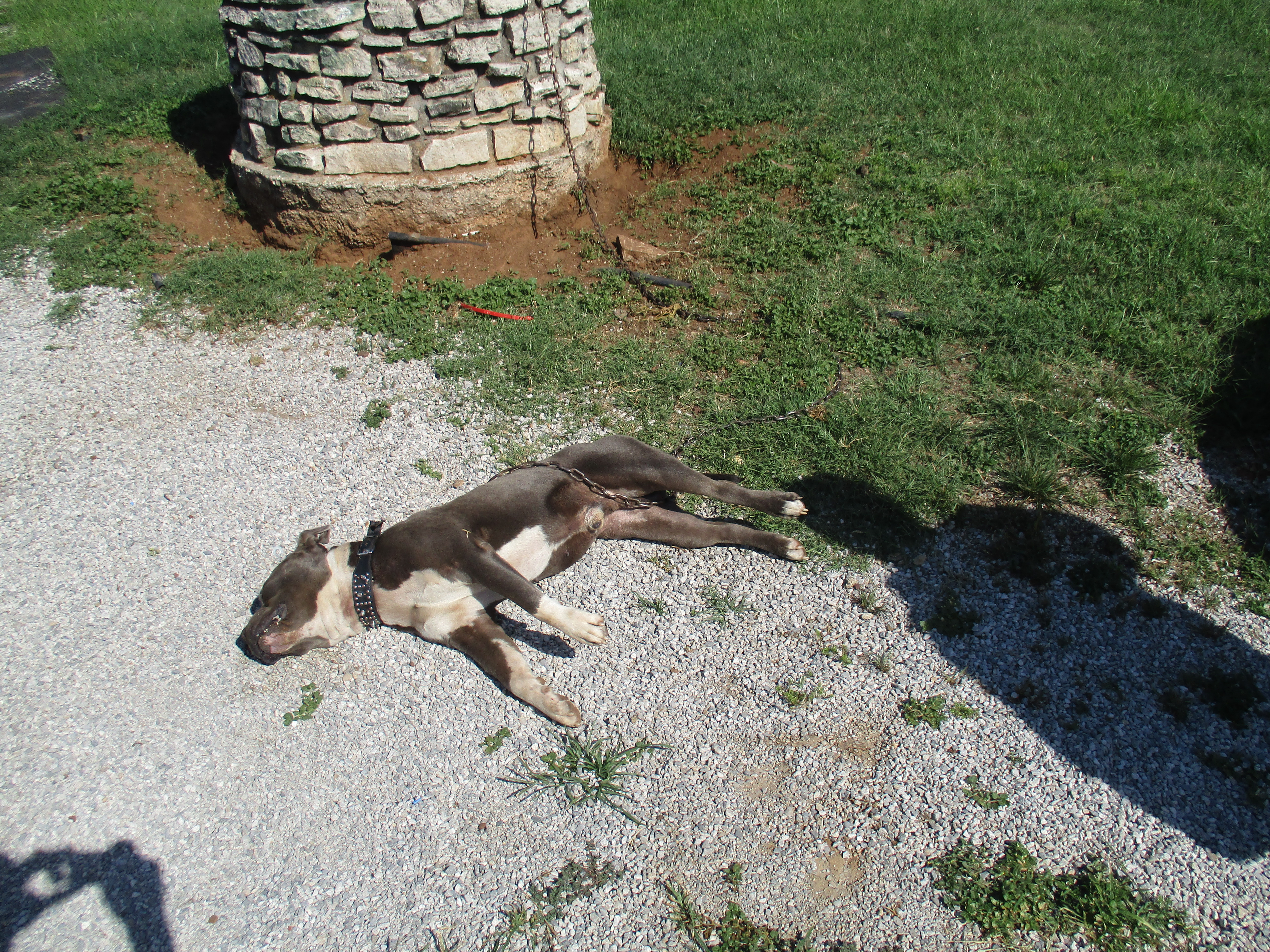 Officers arrived on scene and discovered a deceased adult male pit bull-mix chained to a rock formation in the front of a residence. The dog had no shade, and no water had been made available. A small empty plastic bowl was located in the yard.