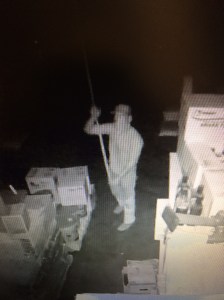 Store security cameras caught the suspect entering the farm and ranch supply warehouse through the ceiling by rappelling from the roof. The suspect panicked after setting off an alarm system of the warehouse. The suspect damaged a window as he made entry into the inner office/store area, and could be seen on the security video frantically maneuvering to exit the building.