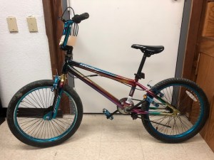 The bicycles are described as a royal blue Mongoose (spray painted with spots of black paint, lacking handlebar grips, and with a ripped seat), and a metallic rainbow colored Kent Fantasy bike.