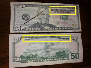 Some of the bills collected recently include advertising notes that appear to look like $5, 10, 20, 50 and 100 bills. The note(s) clearly state they are for “Motion Picture Purposes,” but employees are not paying close enough attention to the markings. The counterfeit bills otherwise look genuine.