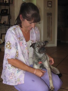 Vet Tech Rhonda Sears loves on Hope, who sports a new necklace from Shadow and Syndey two K-9 friends from Garland, Texas, July 12, 2012.